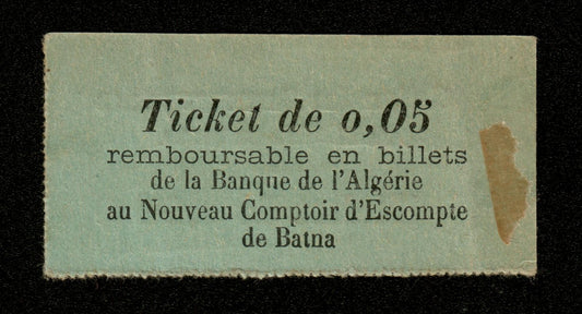 ALGÉRIE - Ville de Batna : Nécessité, Ticket 5 Centimes 1915 - Union des Commerçants, Comptoir d'Escompte