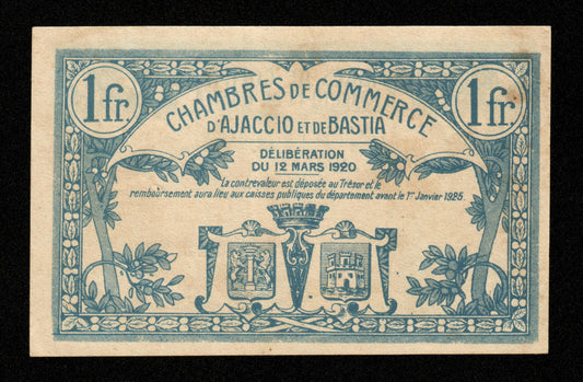 FRANCE - Chambre de Commerce d'Ajaccio et Bastia, 1 Franc 1920 JP.03.09 SUP+ / XF+Prix habituel €25,00 EURPrix habituelPrix unitaire par-