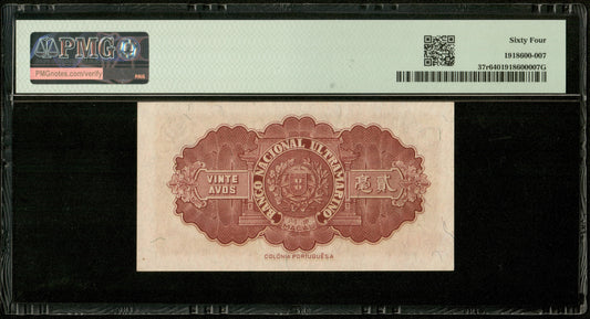 MACAO - MACAU - 20 Avos 1946 Pick 37r NEUF / PMG Choice Unc 64