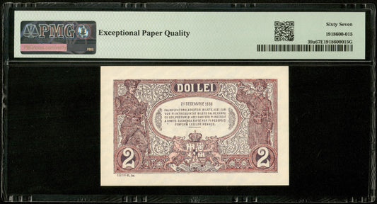 ROUMANIE - ROMANIA - 2 Lei 1938 Pick 39a NEUF / PMG Superb Gem Unc 67 EPQ