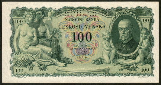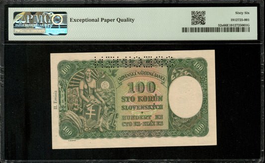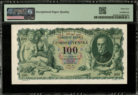 TCHÉCOSLOVAQUIE - CZECHOSLOVAKIA - 100 Korun Specimen 1940 (1945) P.52s NEUF / PMG Gem Unc 66 EPQ