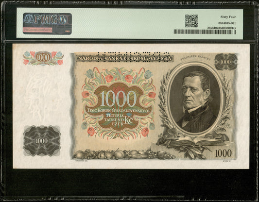 TCHÉCOSLOVAQUIE - CZECHOSLOVAKIA - 1000 Korun Specimen 1934 Pick 26s PMG Choice Unc 64