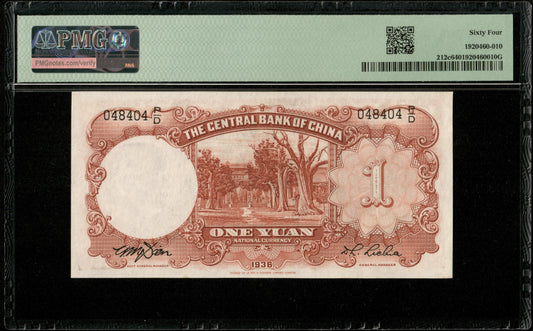 CHINE - Central Bank of China, 1 Yuan 1936 Pick 212c pr.NEUF / PMG Choice Unc 64