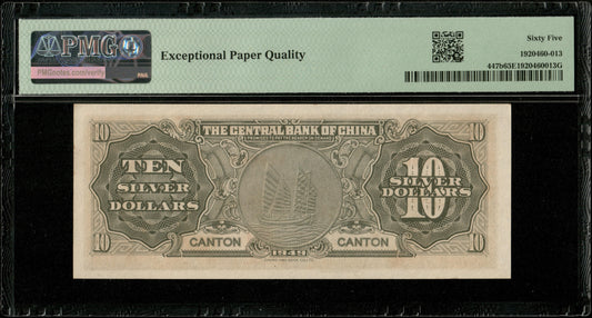 CHINE - Central Bank of China, 10 Silver Dollars Canton 1949 Pick 447b NEUF / PMG Gem Unc 65 EPQ