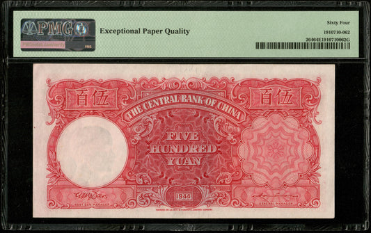 CHINE - Central Bank of China, 500 Yuan 1944 Pick 264 NEUF / PMG Choice Unc 64 EPQ