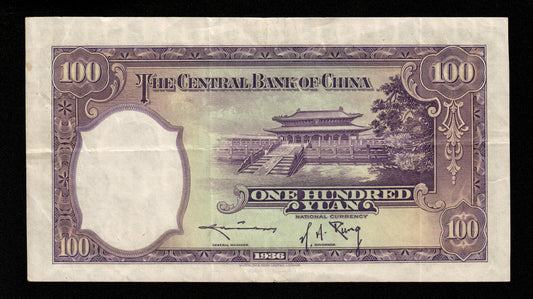 CHINE - Central Bank of China, 100 Yuan 1936 P.220a TTB / VF
