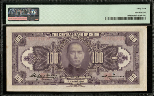CHINE - Central Bank of China, 100 Dolalrs 1928 P.199d pr.NEUF / PMG 64