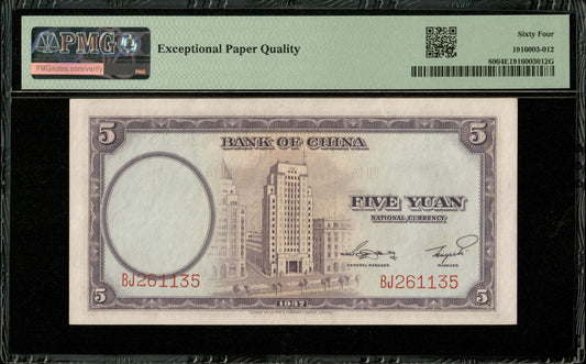CHINE - Bank of China, 5 Yuan 1937 P.80 NEUF / PMG 64 EPQ