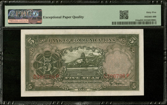CHINE - CHINA - Bank of Communications, 5 Yuan 1935 Pick 154 PMG Gem Unc 65 EPQ