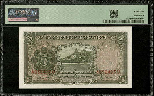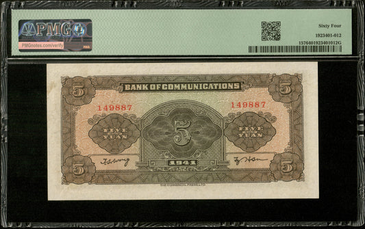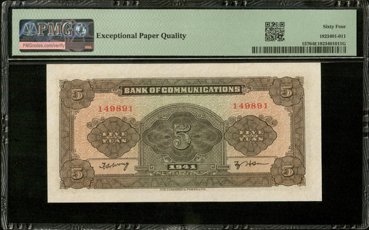 CHINE - CHINA - Bank of Communications, 5 Yuan 1941 Pick 157 PMG Choice Unc 64 EPQ