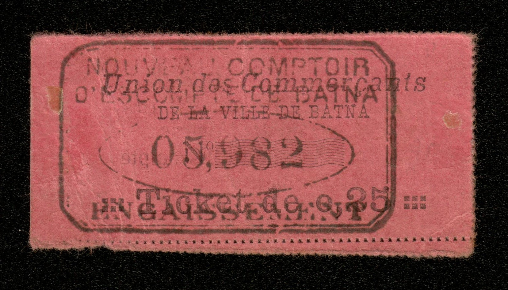 ALGÉRIE - Ville de Batna : Nécessité, Ticket 25 Centimes 1915 - Union des Commerçants, Comptoir d'Escompte
