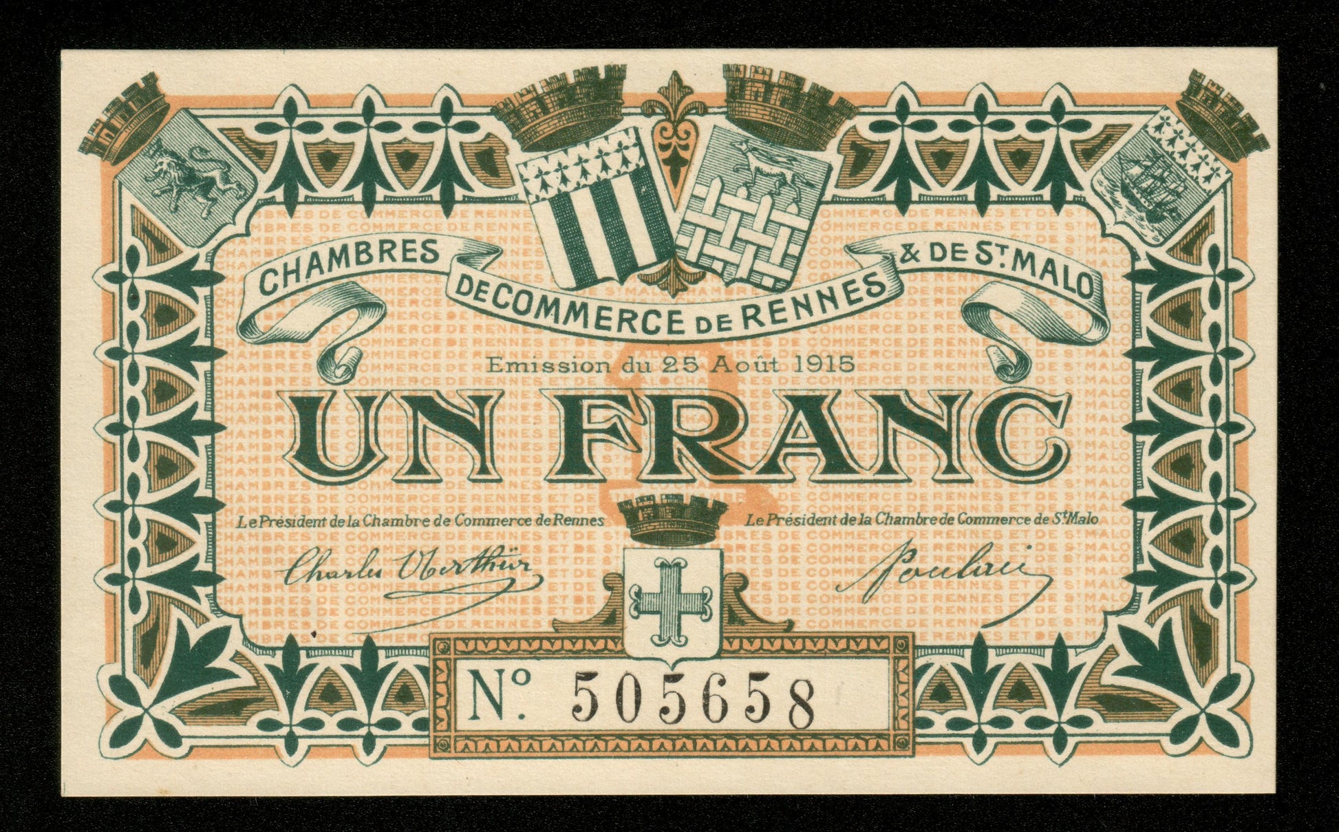 FRANCE - Chambre de Commerce de Rennes & Saint-Malo, 1 Franc 1915 JP.105.03 pr.NEUF / UNC-