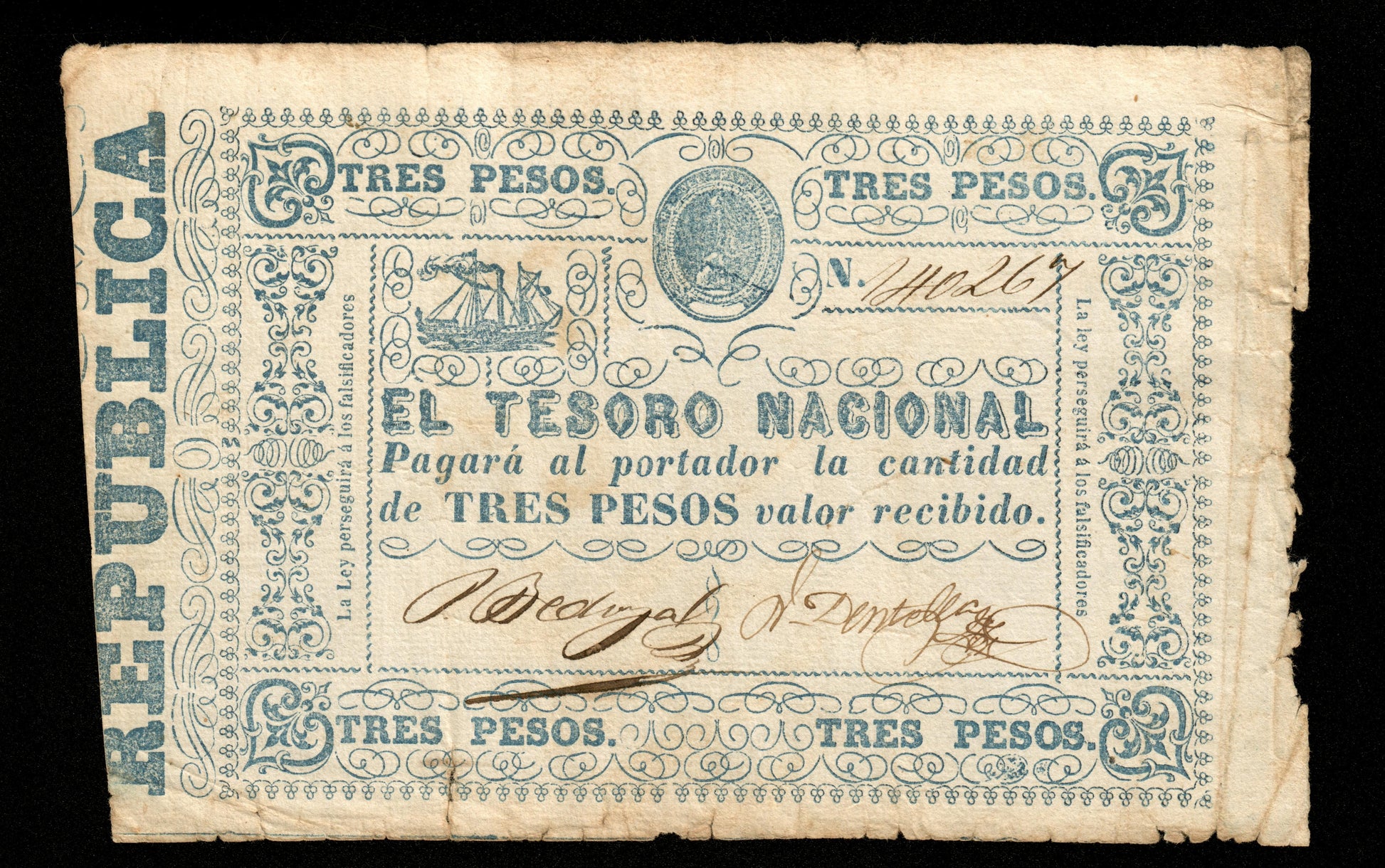 PARAGUAY - Tesoro Nacional, 3 Pesos (1865) Pick 23 TB / Fine
