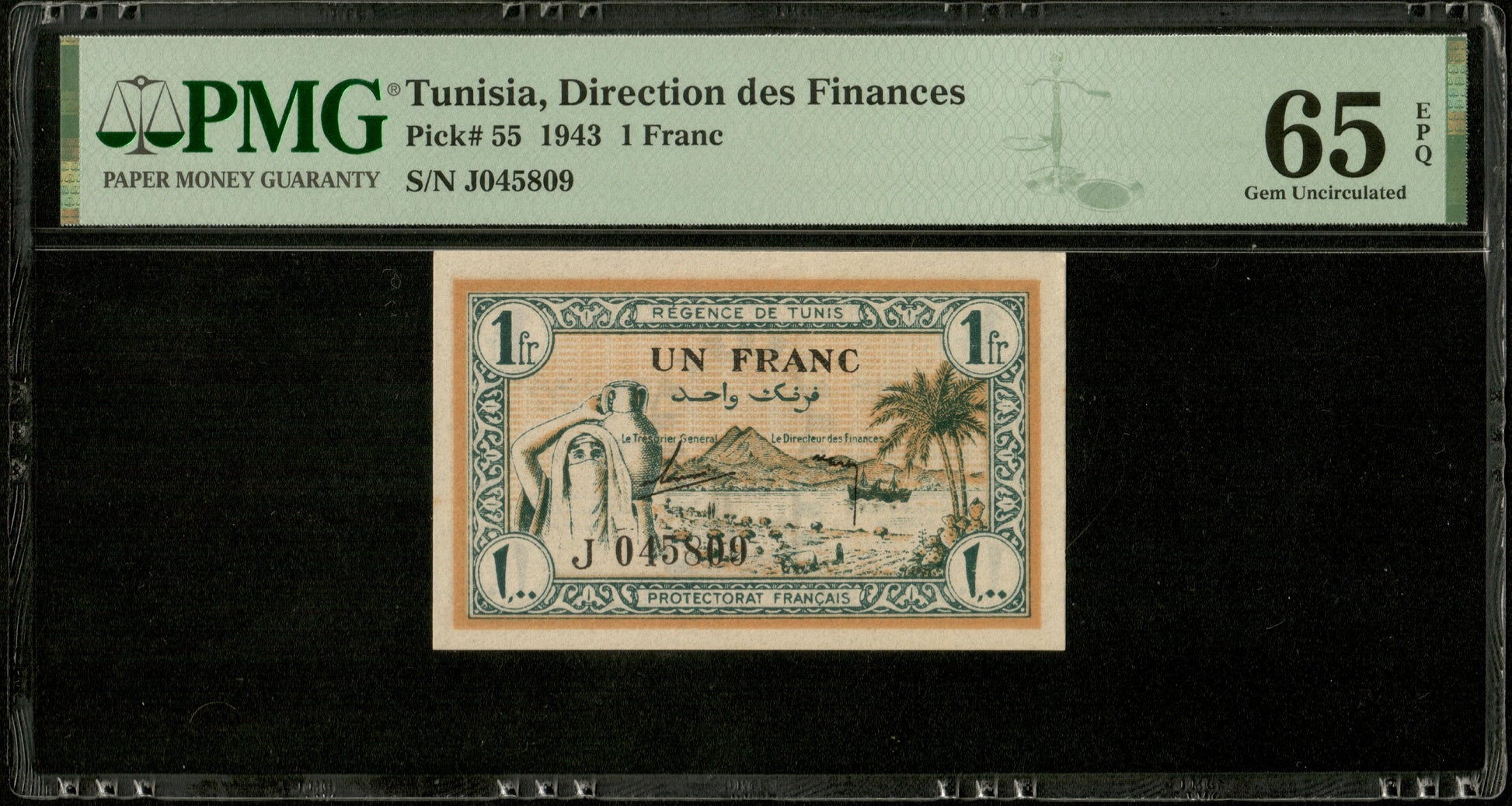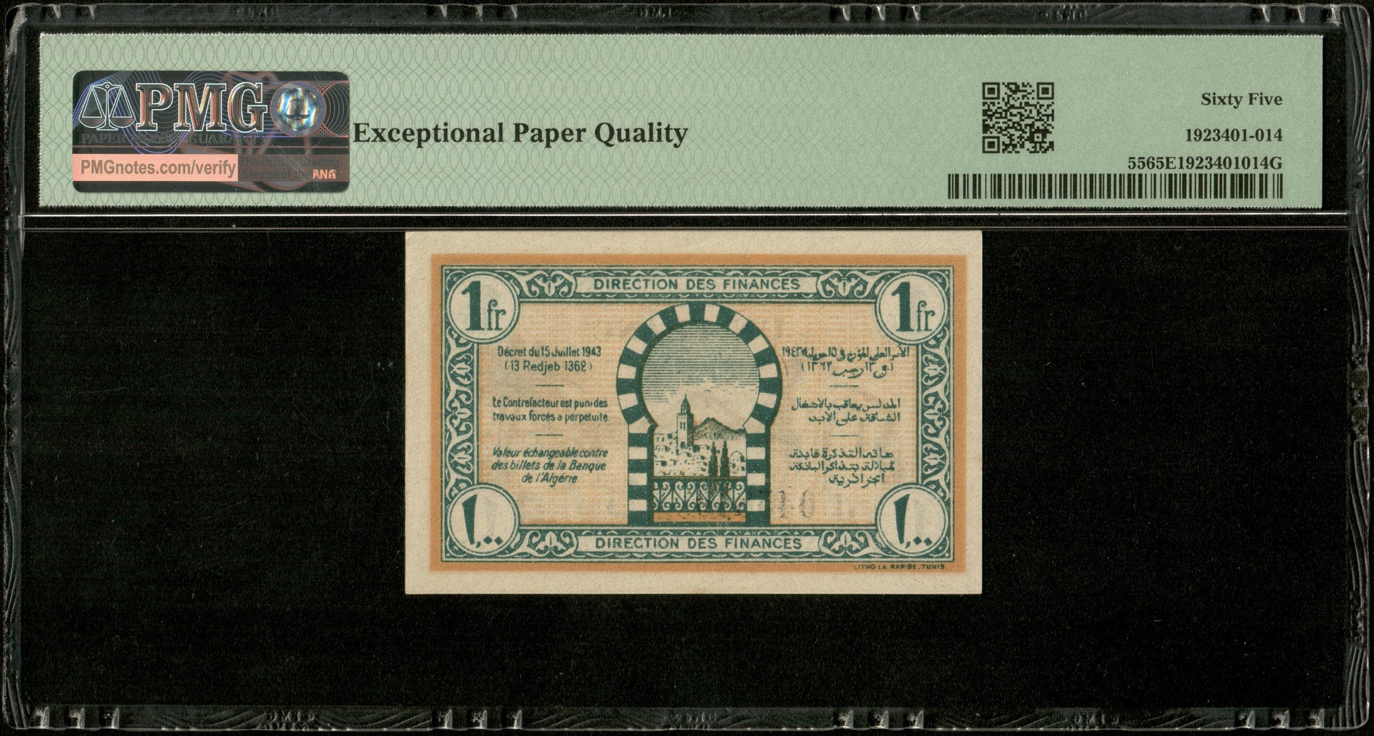 TUNISIE - TUNISIA - Régence, 1 Franc 1943 Pick 55 NEUF / PMG 65 EPQ