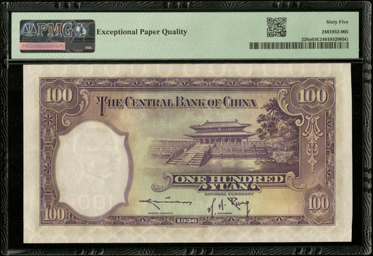 CHINE - Central Bank of China, 100 Yuan 1936 Pick 220a NEUF / PMG Gem Unc 65 EPQ