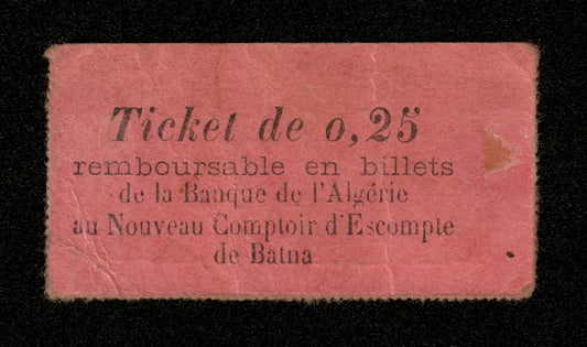 ALGÉRIE - Ville de Batna : Nécessité, Ticket 25 Centimes 1915 - Union des Commerçants, Comptoir d'Escompte (Copie)