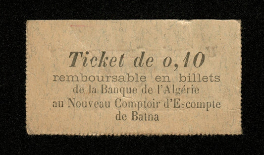 ALGÉRIE - Ville de Batna : Nécessité, Ticket 10 Centimes 1915 - Union des Commerçants, Comptoir d'Escompte
